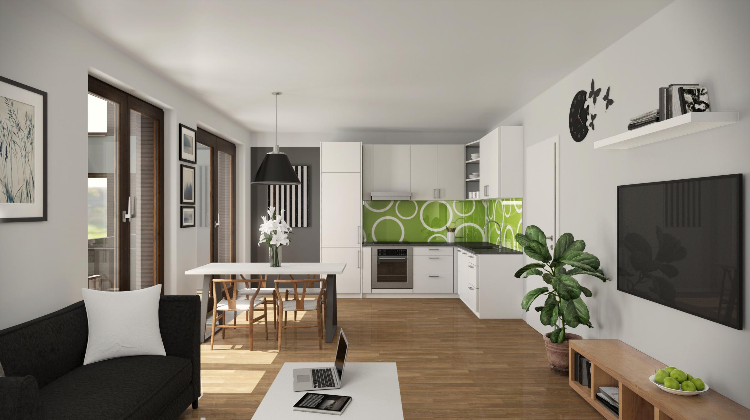 Klademe důraz na modernu a ekologii. Součástí každého bytu je rekuperace či využití dešťové vody pro splachování WC.